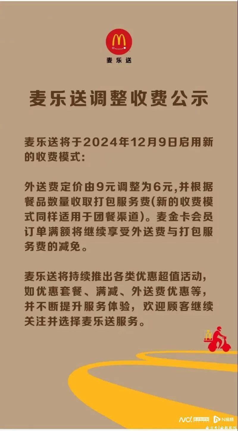 12月2日,麦当劳旗下外送办事“麦乐送”发布转化收费公示称,自12月9日起,麦乐送的外送费订价由9元转化为6元,并凭证餐品数目收取打包办事费,团餐渠说念也同步作念转化。金卡会员订单满额将无间享受外送费与打包费的减免。