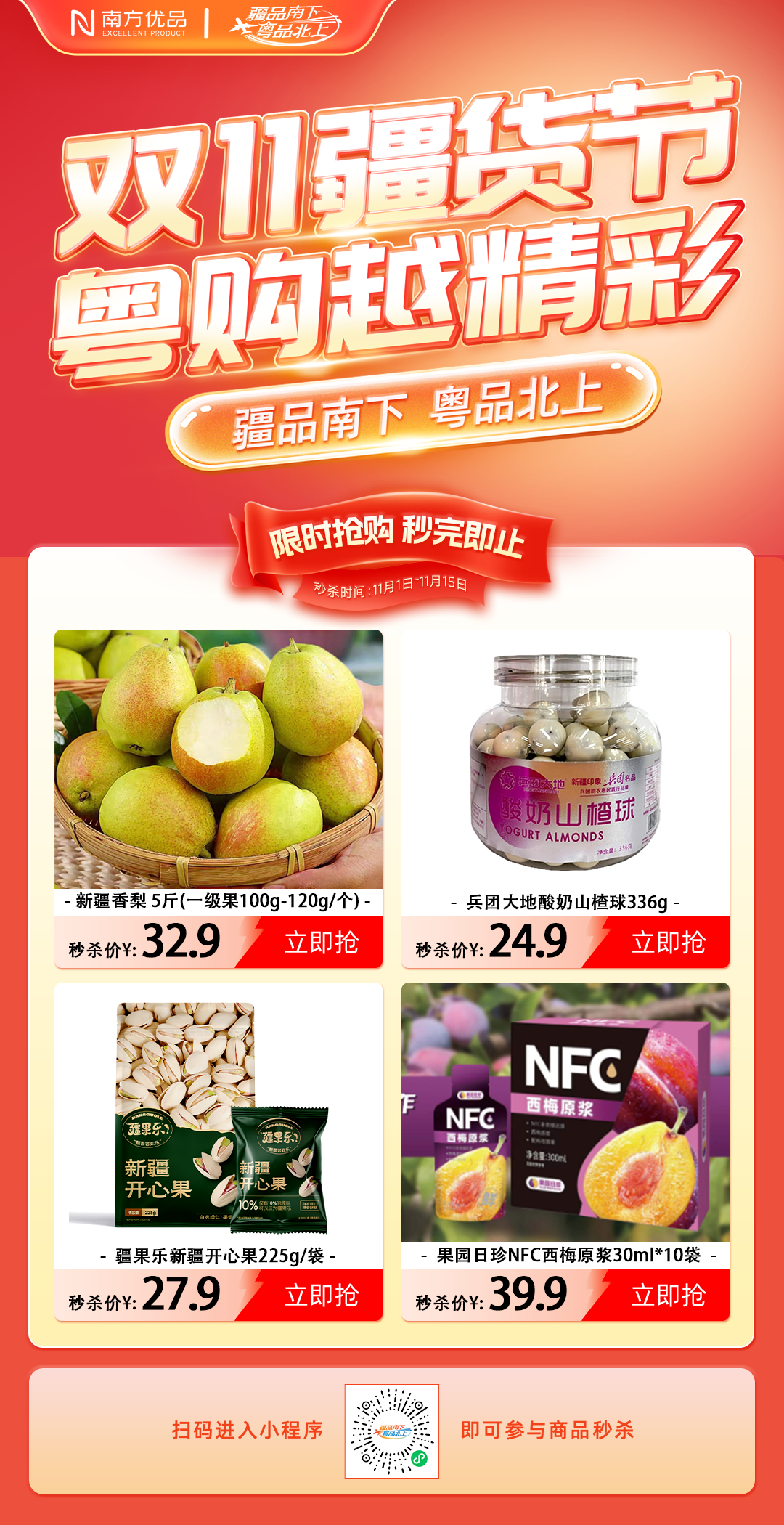 有东谈主说,“双11”是一场购物狂欢;但在南边优品看来,这是一场情意的发奋——从伽师瓜田的晨露,到疏附杏树的晚霞,再到图木舒克市枣林的星光,新疆的好滋味跳动5000公里,只为给湾区的你,递上一份冬日的慈祥。这个“双11”,让咱们全部,用疆品说爱,用粤情传暖,让“疆品南下 粤品北上”的故事,在“双11”的打扰里,再写新篇。